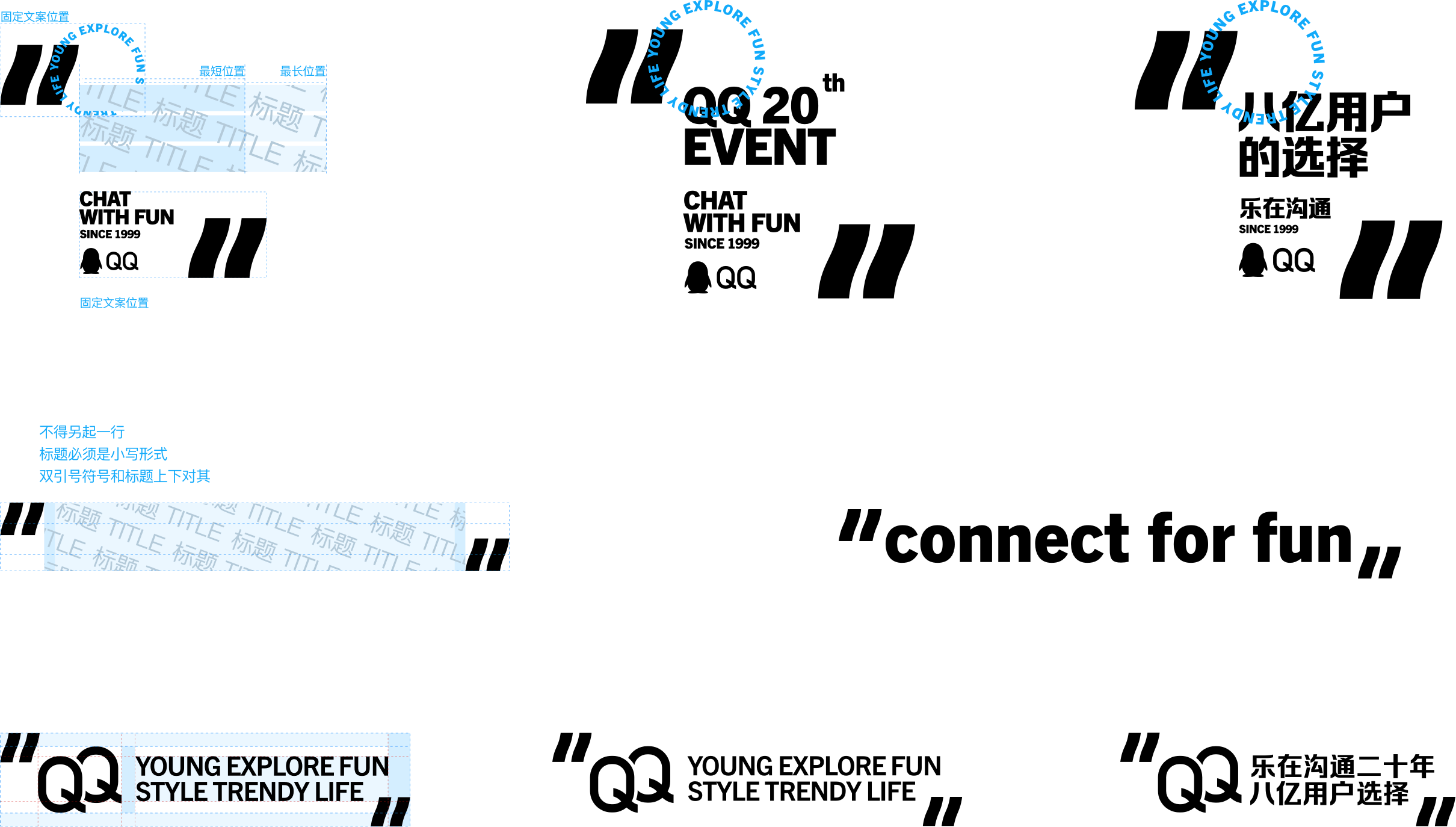 QQ as a social tool. It has extremely strong social functions and attributes, connecting 800 million users to meet their barrier-free communication that breaks through the space restrictions.Therefore, this direction extracts the double quotes, which are symbols of communication in the dialogue content, as the visual elements for extended design. Hope this can convey the brand concept of QQ “Communication” and “Stressless Social”.