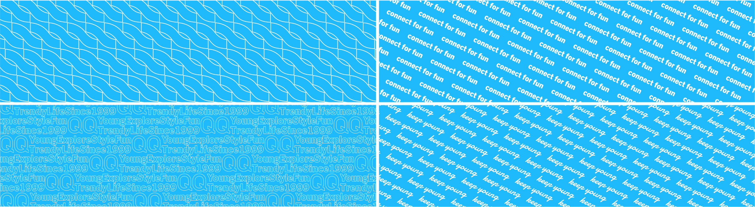 QQ作为QQ品牌除了企鹅形象外最具有符号性的符号,相比企鹅形象其更为简洁、更具延展性。所以该方案尝试将QQ两字母进行组合延展。QQ强调无压力社交、多元化沟通和陪伴的品牌核心价值。通过将QQ两个字母进行组合拼凑,传达出品牌的“多元”“沟通”“陪伴”理念。并且通过图标和文字的排版强化品牌理念。