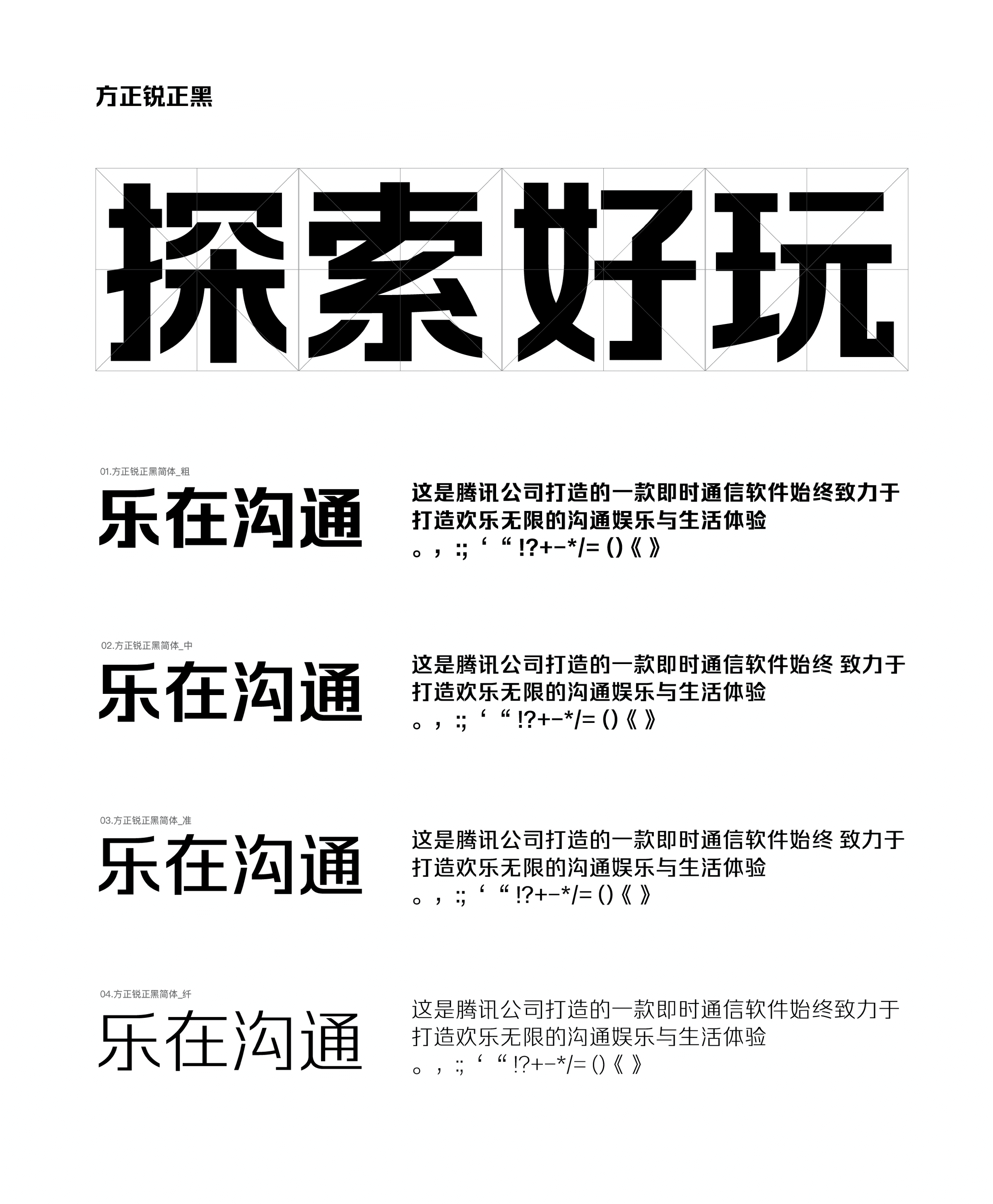 品牌专用字体是品牌视觉识别的重要部分。品牌专用字体风格有助于建立品牌独特的美感。方正锐正黑做为QQ的中文品牌专用字体,被用于品牌产品及品牌视觉传达中。我们需要遵循右页所述的品牌字体运用示例,以确保品牌视觉传达的一致性。