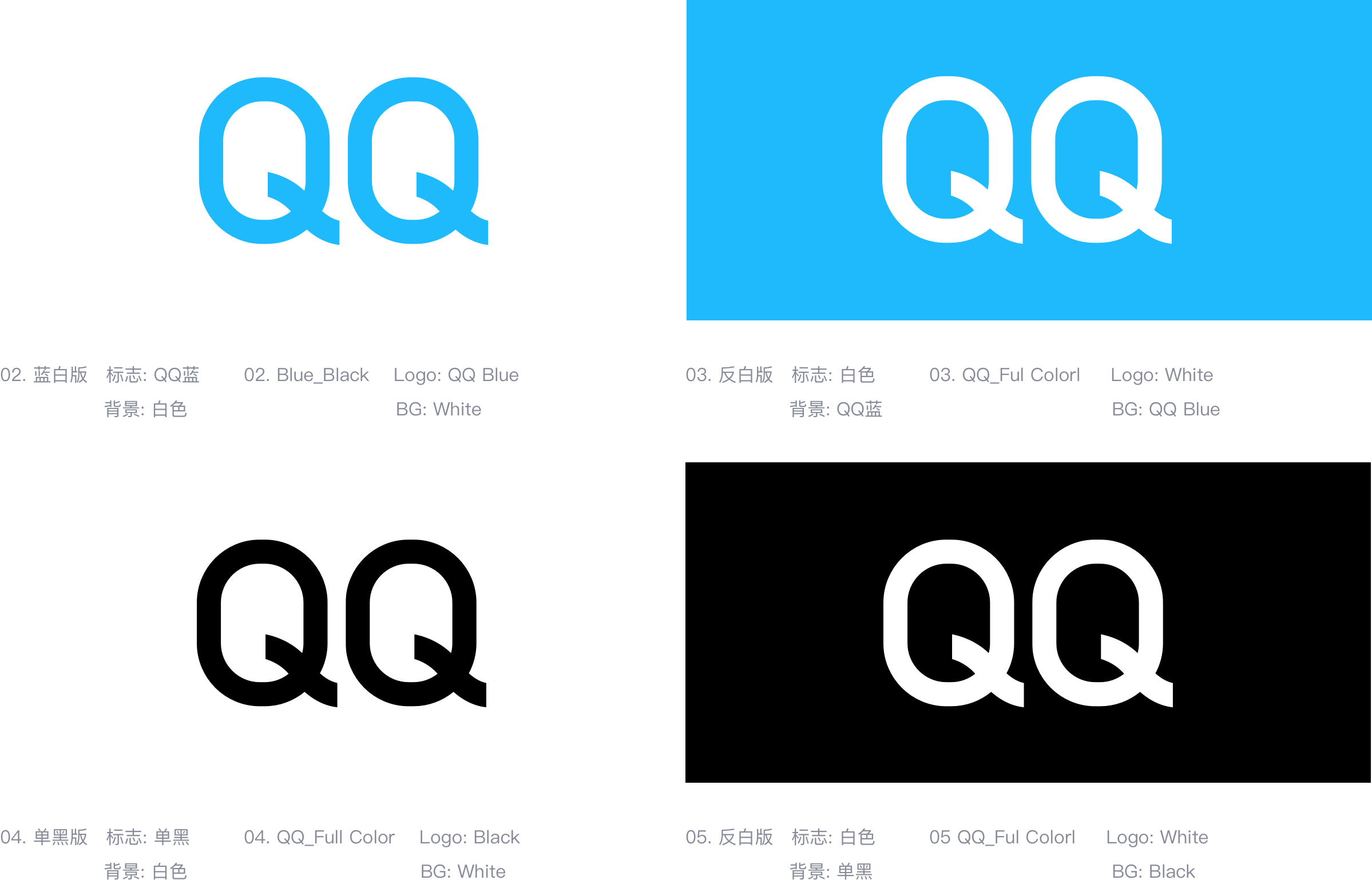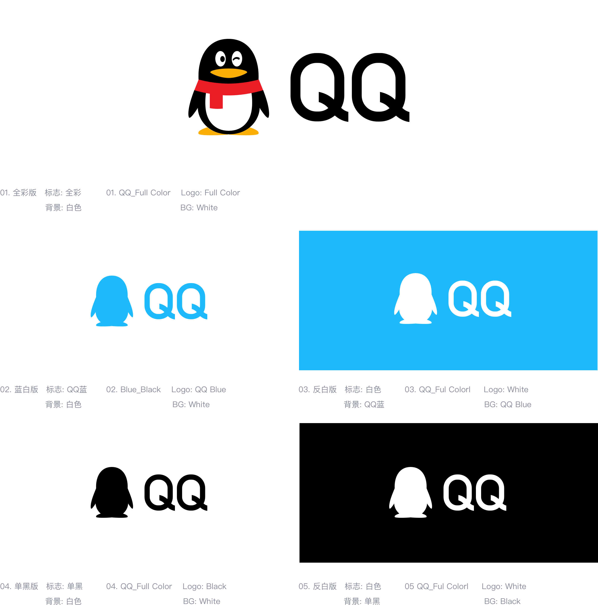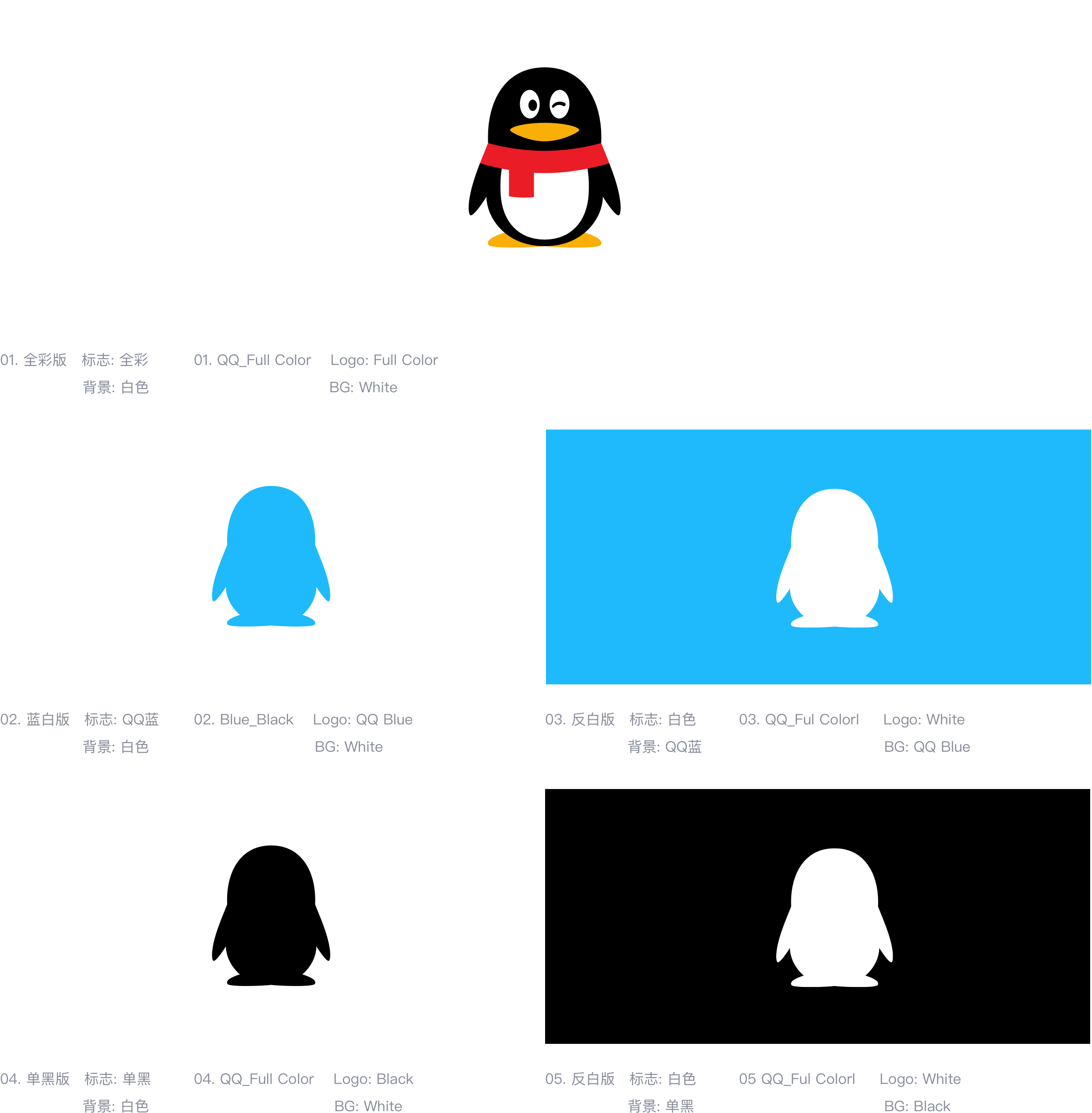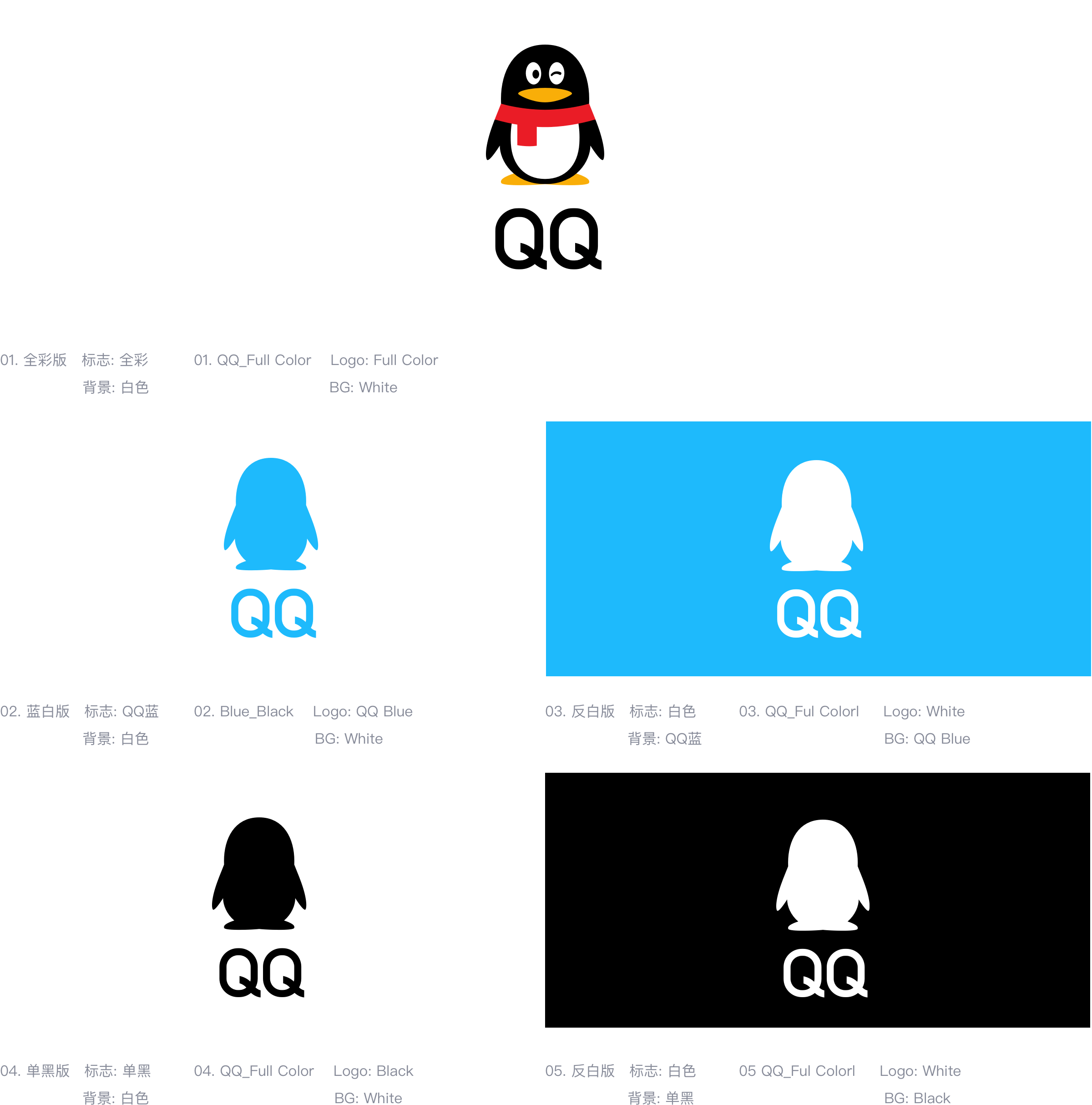 标准标志是QQ的主要品牌符号,多数情况下请使用此标志。它有助于建立品牌识别, 同时传达出品牌信誉与稳定性。QQ标准标志的使用场景分为: 在白色/浅色背景上使用全彩标志或剪影标志;在需要时,深色背景上可使用腾讯QQ蓝标志;在品牌蓝色背景上使用白色标志;当标准标志不能以舒适的方式 使用在单色应用场景时, 例如单色表格, 布艺刺绣, 丝网印刷, 传真纸和备忘录, 可使用单色黑或单色灰标志。