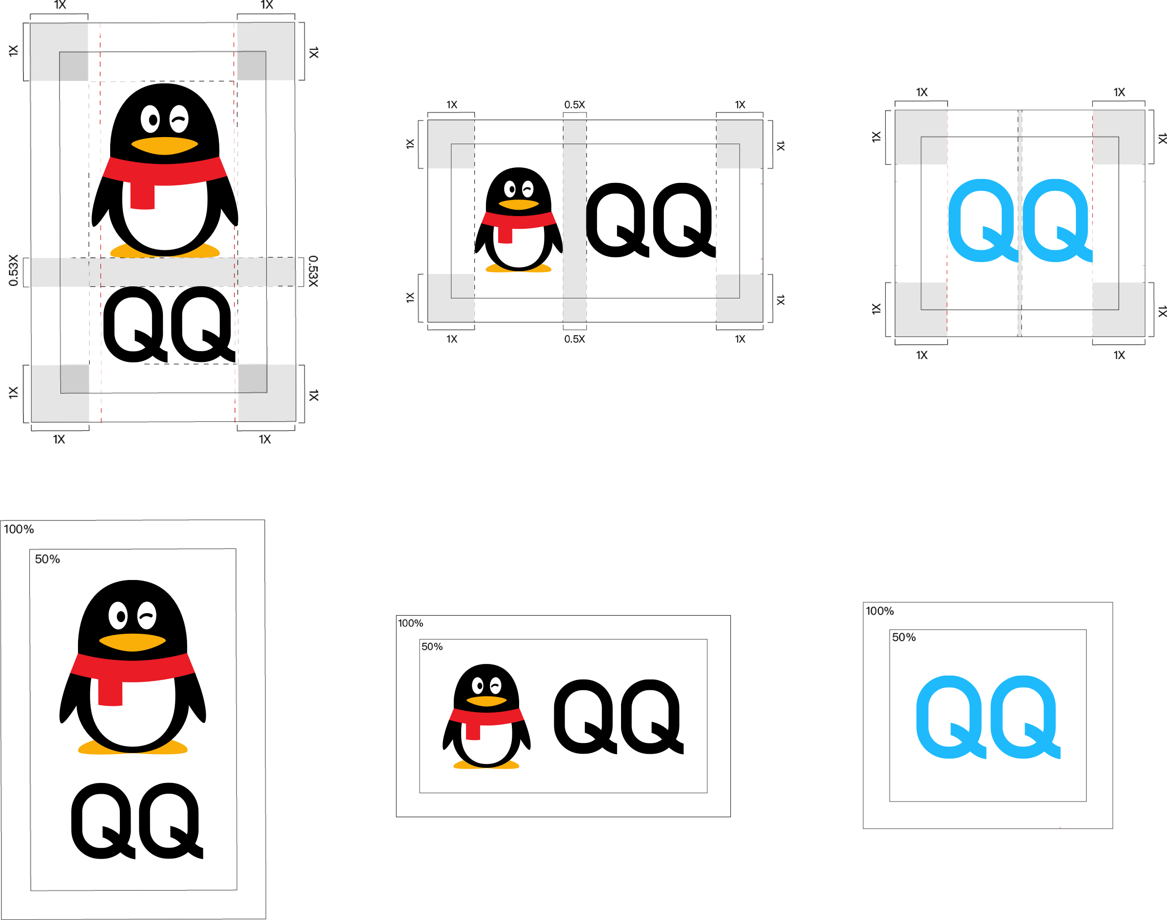 为确保QQ的品牌标志可以在所有应用中被清晰识别, 标志周围需预留一定的安全不可侵犯区域。此区域相当于标志在运用时, 与其他设计元素或文本内容 所应保持的最小距离。为确保标志的完整性与可读性, 此区域大小必须严格遵 守规范。当标志尺寸被缩放使用时, 安全区域大小随之等比缩放。如右图, 以图形标志的宽/高为一个单位“x”作为参考值,一般情况下应保持100%的安全区域,或当100%安全区域不可用时, 使用50%安全区域为第二选择。