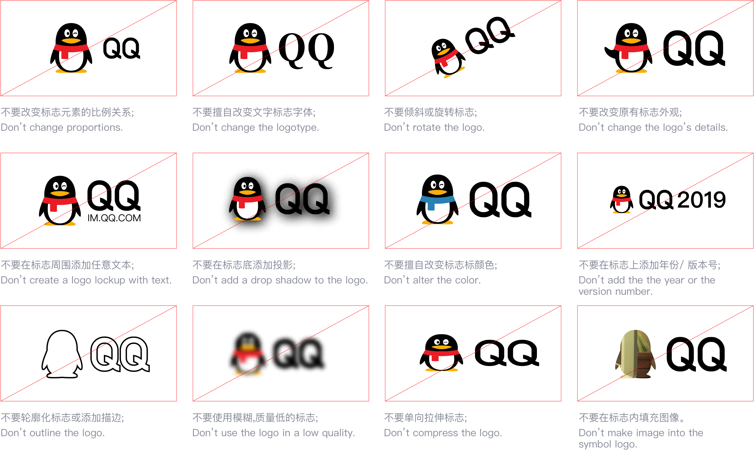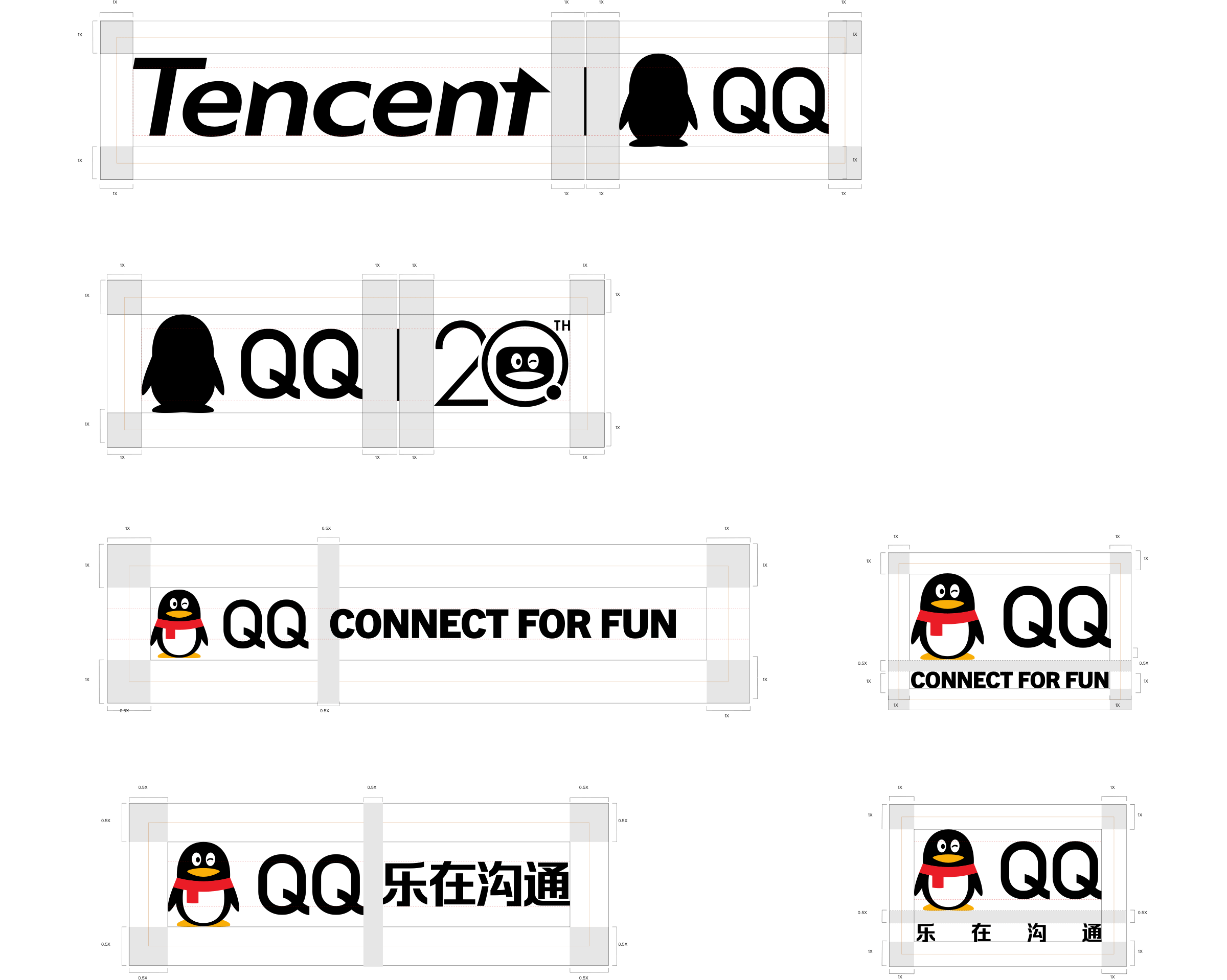 QQ logo is made up of two elements: 1. Symbol 2. Logotype. The relative sizes and positions of these elements are fixed. QQ logotype cannot be used on its own. The primary brandmark should only be reproduced from the master artwork. It should not be redrawn or altered in any way. The master artwork is available in various electronic formats, for both Mac and PC, from Brand Center, ISUX, Tencent.