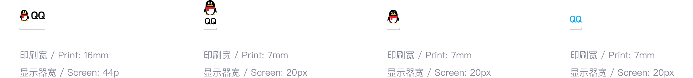 QQ标志没有固定的尺寸大小,其比例关系应由可用空间、美感、功能和可见度来决定。且QQ标志没有预设的最大尺寸,其标准标志的最小印刷尺寸宽度为16mm,最小显示器尺寸宽度为44px。