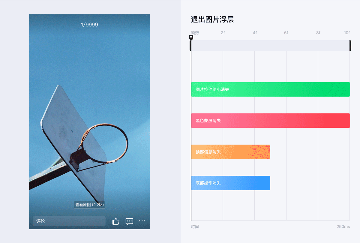 在退出图片浮层时,用户此时不再关注照片的顶部属信息和底部操作,引导用户的视觉回到之前的动态场景是更为重要的。所以在动画顺序的安排上,顶部信息和底部操作消失动画会优先结束,最后结束照片控件缩小动画,从而让用户更能感受到从哪来,回哪去。同时,退出浮层应该是高效快速的,所以在整个动画的时长上也进行了相应的缩短。